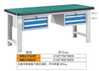 工作臺(tái)介紹WB217522: 工作臺(tái)采用優(yōu)質(zhì)冷扎板精工制作而成,堅(jiān)固的工作桌框架,牢固平穩(wěn),可使工作桌承重1000kg;多種工作桌面選擇,可配合不工使用的要求; 工具吊柜(箱),側(cè)柜(箱)燈架,調(diào)節(jié)腳杯,外形美觀;層板,抽屜質(zhì)量上乘,承重大,抽屜內(nèi)可根據(jù)需要任意分隔;節(jié)約空間,適用性強(qiáng)