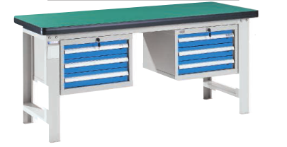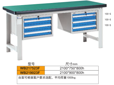工作臺介紹WB-217523: 工作臺采用優質冷扎板精工制作而成,堅固的工作桌框架,牢固平穩,可使工作桌承重1000kg;多種工作桌面選擇,可配合不工使用的要求; 工具吊柜(箱),側柜(箱)燈架,調節腳杯,外形美觀;層板,抽屜質量上乘,承重大,抽屜內可根據需要任意分隔;節約空間,適用性強