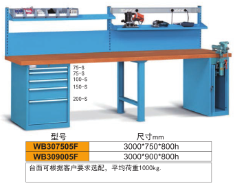 工作臺WB307505介紹: 工作臺采用優質冷扎板精工制作而成,堅固的工作桌框架,牢固平穩,可使工作桌承重1000kg;多種工作桌面選擇,可配合不工使用的要求; 工具吊柜(箱),側柜(箱)燈架,調節腳杯,外形美觀;層板,抽屜質量上乘,承重大,抽屜內可根據需要任意分隔;節約空間,適用性強