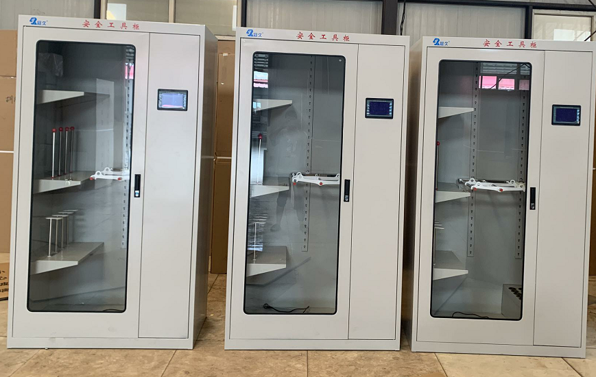在國內電力行業中,廣泛使用絕緣工具進行帶電作業或操作。受潮后的絕緣工具絕緣性能下降,嚴格危及檢修人員的生命安全?,F有的措施是采用木質或鐵質的柜體或絕緣工具庫存房進行絕緣工具的存放或保管。木質、鐵質工具柜都不具備長期恒定的防潮作用,極易受潮,但這種庫房投資大,能耗高,干燥過程緩慢,特別是絕緣工具少的單位,也沒有必要建立絕緣工具庫房。我公司生產的產品智能安全工具柜,有效地解決了上述問題,得到了廣大用戶的歡迎。智能安全工具柜由優質鋼板整體卷壓成型,整體造型采用現代工業控制屏柜的風格,表面噴塑,密封性達到EN60529/IEC529標準的防護等級-IP5級;正面為玻璃觀察門,觀察方便,并裝有門控照明燈,門右側裝有顯示和控制操作面板(ADZ-3/4型),實時顯示柜內和柜外的溫度、濕度和設備運行狀態。柜底安裝有四個萬向輪和定位螺桿;柜頂裝有四個吊杯,方便運輸。我公司生產的智能安全工具柜,采用大屏幕液晶數字顯示,能準確地提供你所需要的信息,以及柜內工具的狀況及數量。我公司為方便廣大客戶,滿足客戶的不同需求,所有安全工具柜均可按照客戶要放置的物品型號、數量、種類來為您量身定制適合您的安全工具柜。歡迎來電咨詢智能型安全工具柜!智能型安全工具柜是河北三棵松科技有限公司新一代的工具柜產品,說到特點的話。對比之前的安全柜具有運行更加穩定、除濕溫升更小、顯示更精確、操作更加簡便、密封性更佳。配電房安全工具柜_安全工具箱生產廠家