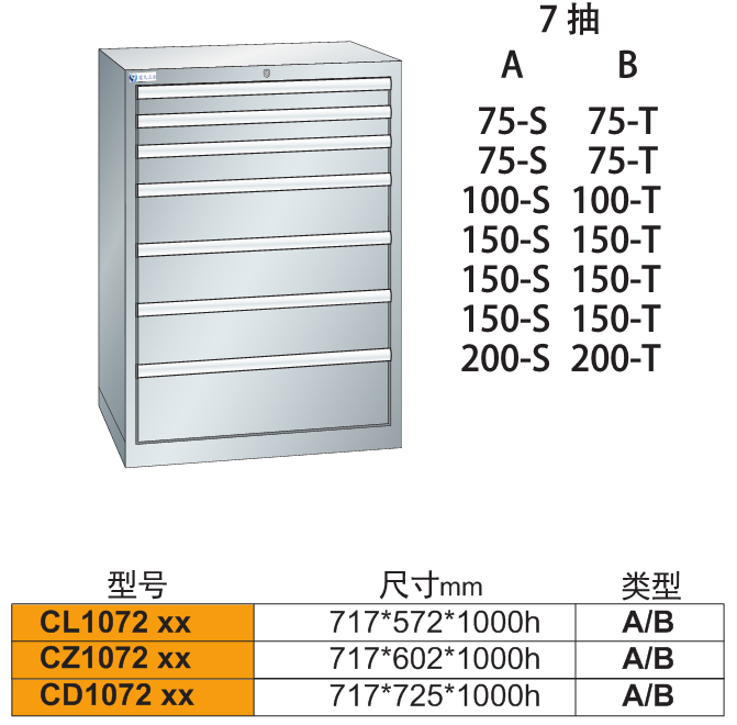 工具柜C1072介紹:工具柜適用于工具、刀具、零部件在生產現場中的定置管理,7抽抽屜式設計,使你的物品存取工作真正做到準時、準確、卓效、低耗。