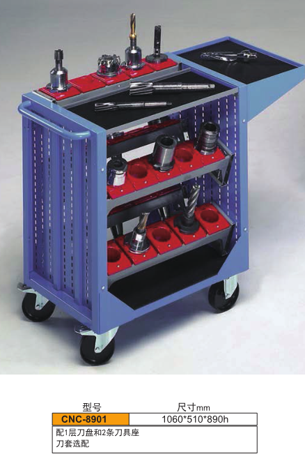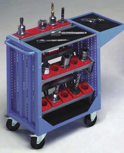 刀具車是存放、搬運刀具的裝備,這里以‘現代貨架廠’生產的HY-HSK系列型號為例,此類刀具車可存BT30、BT40、BT50、HSK63、HSK100等多種型號的刀具。多邊成型的整體式側板上有模數化的人字孔,可將刀座按水平或15°、30°傾斜放置,方便多種刀具的存取。HY-HSK系列可根據需要選擇帶抽屜或不帶抽屜的刀具車。