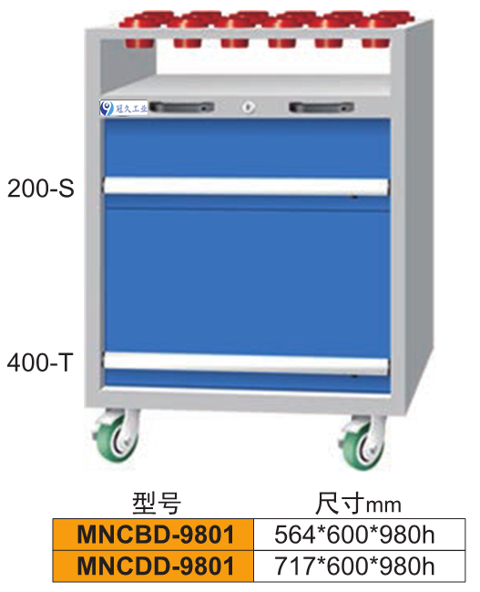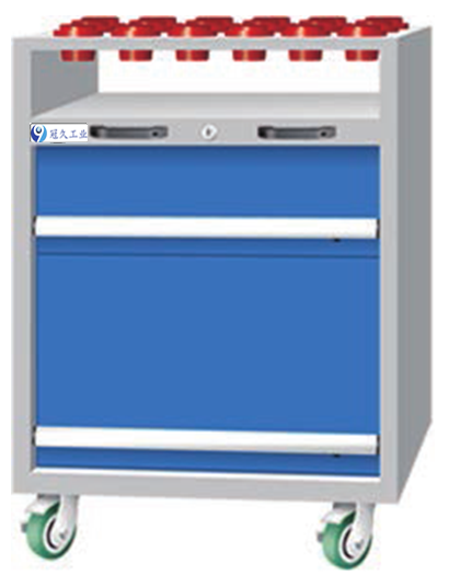 刀具車是存放、搬運刀具的裝備,此類刀具車可存BT30、BT40、BT50、HSK63、HSK100等多種型號的刀具。多邊成型的整體式側板上有模數化的人字孔,可將刀座按水平或15°、30°傾斜放置,方便多種刀具的存取。 高強度腳輪,車前為兩個定向輪,車后為兩個萬向帶 剎車輪,推行平穩(wěn),方向性好,剎車固定后不會滑動。