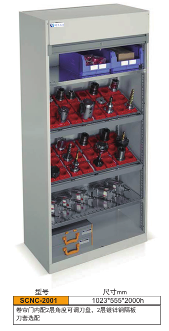 刀具柜,是專門用來存放各種車床上常用刀具的柜子。刀具柜的柜體一般采用冷軋鋼板制成,堅固耐用。刀具柜內常有3-5個橫檔可拉抽屜,抽屜內有ABS材質的刀具套,防滑防油,以便刀具自由組合式的存放。刀具柜一般都為雙門對開式,柜體裝有可調式腳墊,柜體可調整高度,柜子防滑防潮。刀具柜常用在工廠機加工中心,便于刀具的集中管理,取用方便。