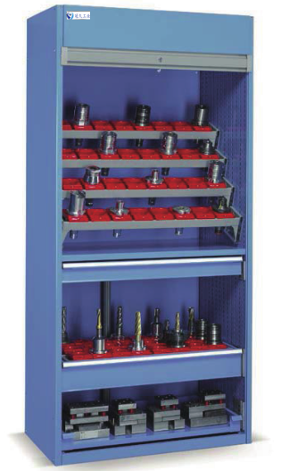 刀具柜,是專門用來存放各種車床上常用刀具的柜子。刀具柜的柜體一般采用冷軋鋼板制成,堅固耐用。刀具柜內(nèi)常有3-5個橫檔可拉抽屜,抽屜內(nèi)有ABS材質(zhì)的刀具套,防滑防油,以便刀具自由組合式的存放。刀具柜一般都為雙門對開式,柜體裝有可調(diào)式腳墊,柜體可調(diào)整高度,柜子防滑防潮。刀具柜常用在工廠機加工中心,便于刀具的集中管理,取用方便。
