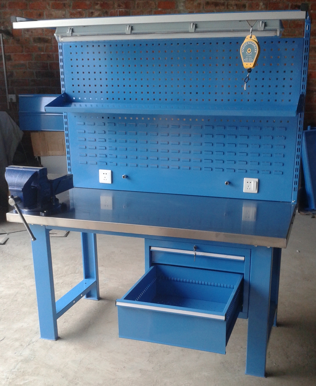 工作臺,配置有各類掛板,擱板或吊柜,完全匹配作業習慣和需求,與其說是一個工作臺,不如說是一套完整的工作系統或是一個工作系統站。因為工作臺滿足了作業平臺,作業取料,作業檢驗的整體需求,它是一種整體解決方案。只要伸手就能解決的問題就是提高效率的動作,簡單的工作臺,就是桌架和臺面組成,有時員工需要放些螺絲等小型物料,直接放到桌面上,除了會減少作業面積,還是影響整個車間的形象。這不符合6S的要求。所以,一套完整的工作臺是每個工位必備的器具。