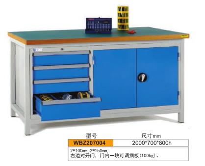 工作臺介紹: 工作臺采用優質冷扎板精工制作而成,堅固的工作桌框架,牢固平穩,可使工作桌承重1000kg;多種工作桌面選擇,可配合不工使用的要求; 工具吊柜(箱),側柜(箱)燈架,調節腳杯,外形美觀;層板,抽屜質量上乘,承重大,抽屜內可根據需要任意分隔;節約空間,適用性強
